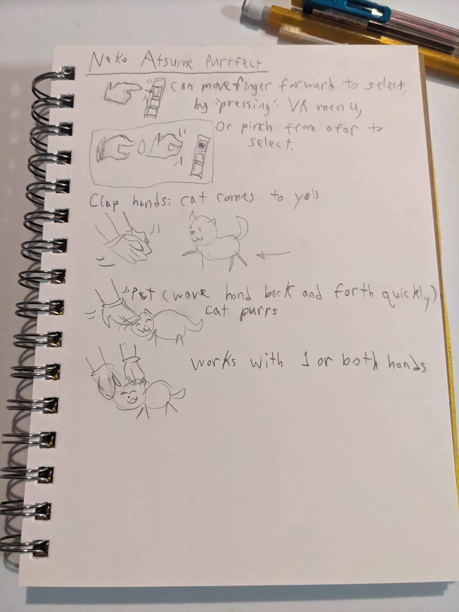 The two petting techniques can be done in either order. Patting the rat should be a palm-down gesture widely accepting of wrist rotation for 3 seconds to trigger part completion. Scratching the rat behind the ears should be recognized through a repetitive pinch-and-release gesture for 3 seconds to trigger part completion, and be widely considerate of the many speeds the user may use. The user can pet the rat more after task completion, but this will not progress the game.