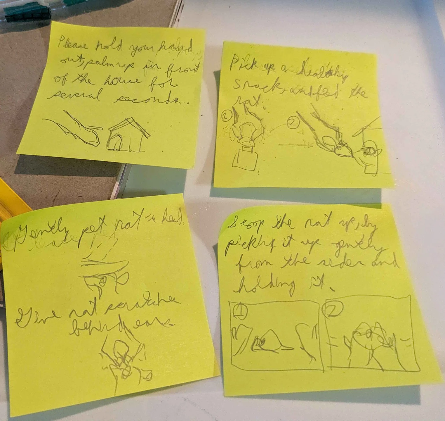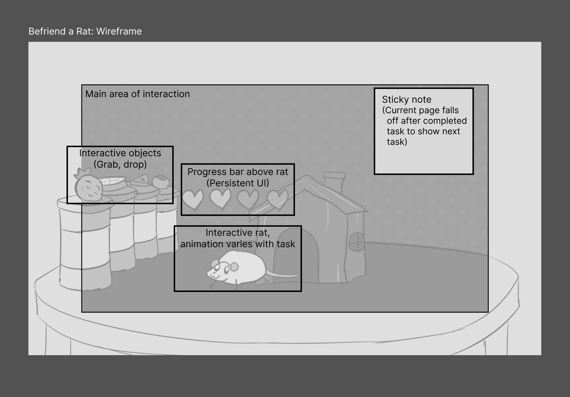 Grabbable objects (snacks) are placed at the interaction periphery to indicate secondary importance, and elevated to be out of reach so the rat cannot immediately reach them. Sticky notes on the wall were my choice for instructions, as they are a familiar item for keeping memos in the real world.