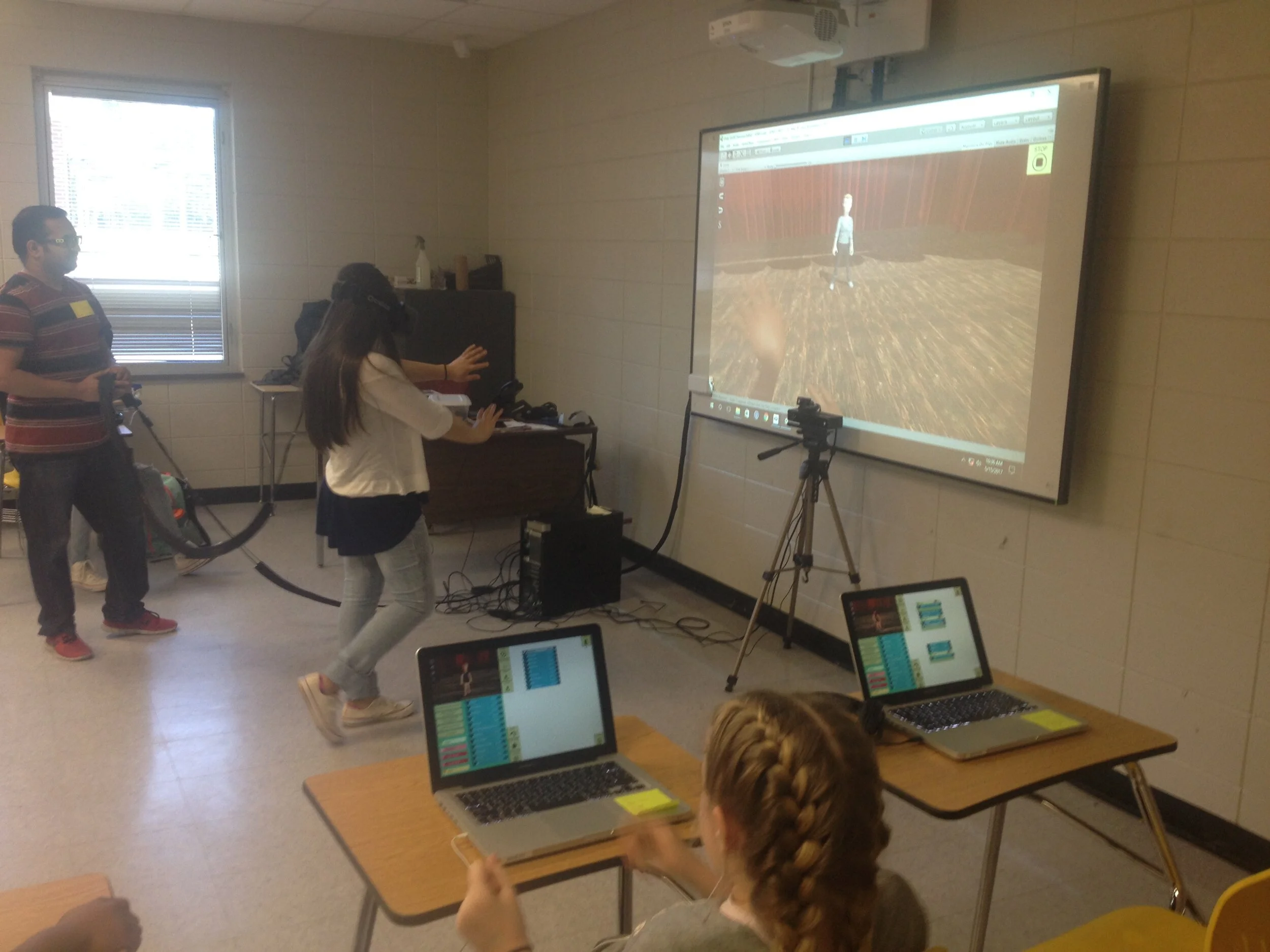In each session, students learn a dance sequence, such as part of the Cha Cha Slide, then they learn a computing concept, and are asked to code their dance moves into the VEnvI interface. To help them conceptualize their own designs, they are encouraged to get up and dance anytime while coding. All students also had the opportunity to dance in virtual reality along with the character.